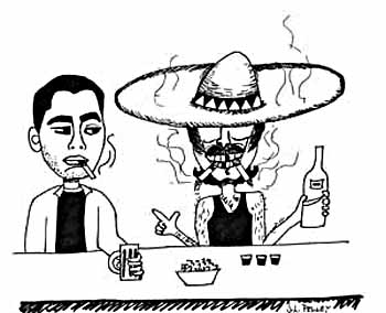 Happily, I lit another cigarette, just to prove to the lady that I was, in fact, a smoker of Camels and a heavy one at that. She, much like my bartender, didn't seem impressed and went off with some other guys who probably smoked menthols. Then I notice the guy next to me. He's bald, shaved fuzzy bald, with an earring like pirates wear in one ear. His face is lean, not emaciated and he is wearing an iridescent red shirt, which still shone brightly in the shadows. "Haylo, Ay noteez you birdday eez may birdday!" he shouted, waving and pointing at my driver's license, newly returned by the cigarette lady, who was now probably dancing on tabletops in front of other guys with my bartender serving up free Rheingolds and Camels. "What?" I ask. "You birdday eez may birdday! You eyedee! Awgist one!" |