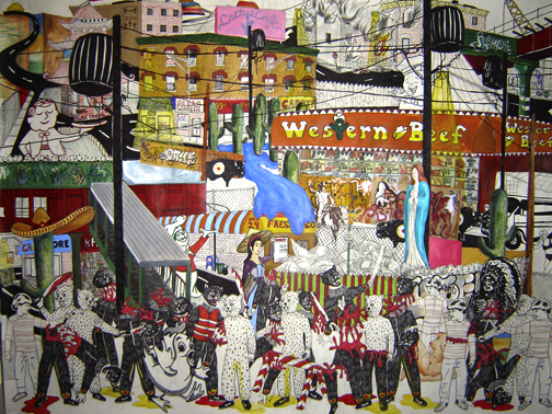 A gourmand's true fantasyland with kosher cooking, tex mex fare, a taste of the Orient, and a plethora of pizza joints, this collage captures the true flavor of a developing neighborhood. If the mutli-culti cuisine can cohabitate, why can‚t the kitties and little boys play nice? The Virgin Mary presides over the squalid buffet, perhaps contemplating her order. Hey Mary, want some fries with that shake?