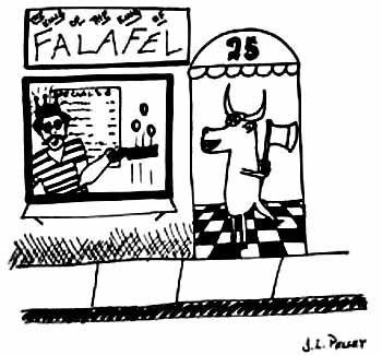 One day Shuki drank a jar of olive oil and bit into a shwarma at Benny Ovadiah's restaurant. He threw up on the floor right in front of the King of the King of Falafel and screamed, "Bad lamb! Bad lamb!" But Benny Ovadiah had seen Shuki hanging out with Mordechai and beat him with a broom. "Don't break your teeth. I'm not leaving," Benny Ovadiah shouted as he brought the broom down onto Shuki's head. "What about the Messiah?" Shuki said. "Show me the Messiah." Frustrated and tired of falafel, they ate hamburgers at the new McDonalds, where Shuki tried to lighten the mood, moving the buns of his burger like the mouth of a hand-puppet. "I am the red heifer. I taste better with cheese." And he bit into the burger laughing. "I am the pink heifer," Mordechai said, holding his burger. "Cook me some more, please." "Stupid!" Shuki said, hitting Mordechai on the forehead with the palm of his hand. "Don't you remember from religion class in school where God told the Children of Israel to purify themselves." "Take a shower," Mordechai said, laughing. "With soap!" "He told them to sacrifice a red heifer, a pure red heifer without blemish or spot, because only the ashes of a red heifer can purify Jews so the can rebuild the Temple," Shuki paused and beat a drum roll on the table. "And-bring-the-Messiah-the-King-of-Israel." "But there hasn't been a red heifer in Israel in over 2,000 years," Mordechai said, remembering the mysterious passage calling for the sacrifice of a pure red heifer. "Yes," Shuki said, "that is true. But now. . ." And he began to hum, and then Mordechai joined in and they were singing, "Moshiach, Moshiach, Moshiach!"