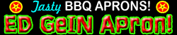 Yepper, feast upon this tasty little treat that is brand new on the Gein scene - A Genuine Ed Gein BBQ Apron! Dear ol' Eddie was Wisconsin's original Cannibal whose interesting diet of human flesh (not to mention grave robbing, murder and necrophilia) inspired such classick films as Hitchcock's "Psycho", "Texas Chainsaw Massacre", and "Deranged. So what could be a more suitable Kooky Kannibal Kollectable than this Official Ed Gein Apron! This is a fitting tribute to Gein's legacy of lunacy! This restaurant style, fully adjustable heavy canvas apron features a Graveyard Ghoulish photo of ED and terrifying text claiming Gein's reign to being the ORIGINAL Wisconsin Cannibal-yep, Jeffrey Dahmer gets most of the press these days but never forget Gein was the first and the WORST! One of really cool things about this culinary curiosity is that the apron is Bone white so the more stuff you spill on it (BBQ sauce, cranberry juice, ketchup, blood etc.,etc.) the more authentic it looks! The crime scene photos proved that Ed was a VERY messy cook!
