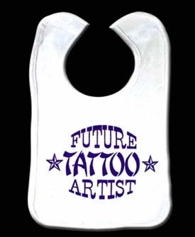 It's a well known fact that parents want their children to grow up to be something great. While most "normal" parents want their kids to be a doctors, lawyers, or even the President, there are those of us out there who want them to aspire to be something REALLY Great ÐA TATTOO ARTIST! With this awesome bib you can show the World what your high aspirations are for your lil' artist are! Who knows he/she just might grow up to be the next Paul Booth or Jack Rudy of their generation!
